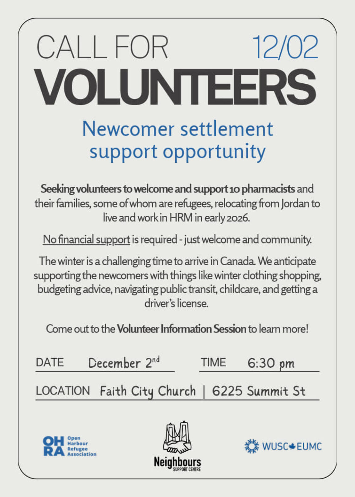The Train to Hire program is a new pilot that supports the resettlement of Jordanian and refugee pharmacists from Jordan to Nova Scotia. We are looking to recruit volunteers who will support the newcomers with their new journey in Canada. The is no financial support required from any of the volunteers who choose to work with us.